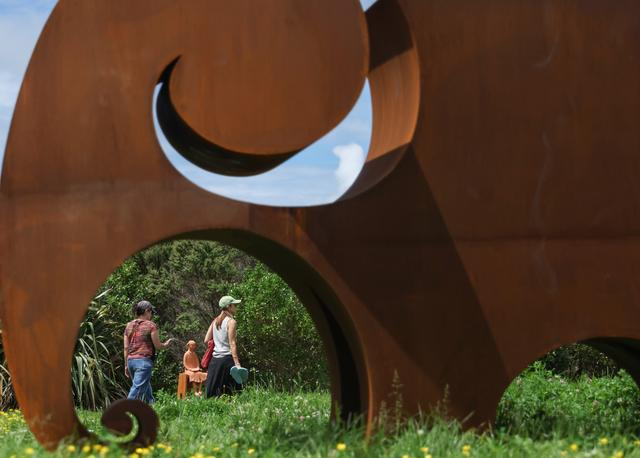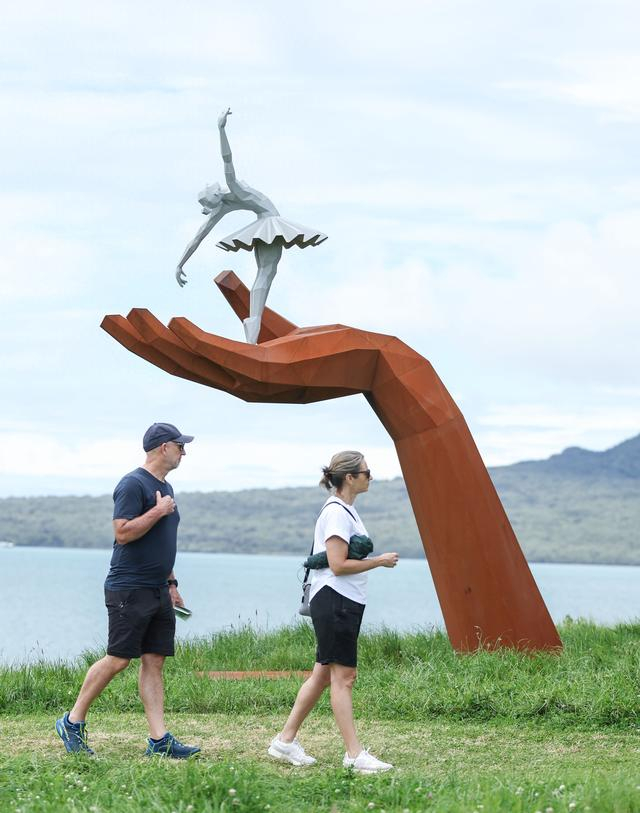 ↑11月9日,人们在奥克兰举行的新西兰海岸雕塑展上参观。