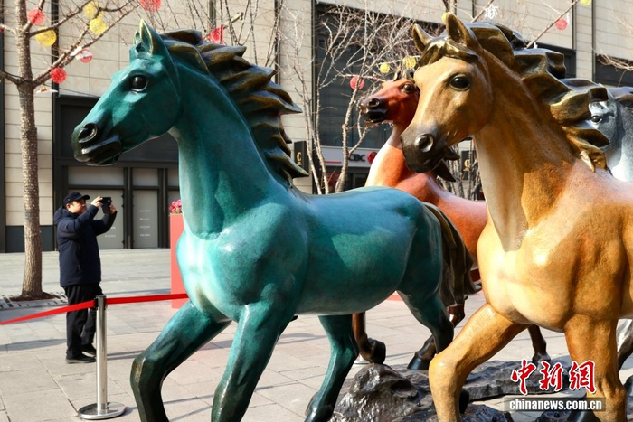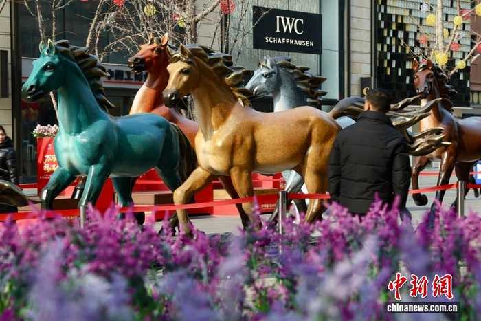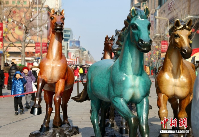1月29日,在北京王府井大街上,中国工艺美术大师朱炳仁的作品《王府八骏》吸引游人驻足观赏。马年将至,北京一些与马相关的艺术装置纷纷亮相,尽显年味。中新社记者 易海菲 摄