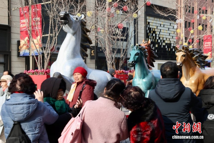 1月29日,游客在北京王府井大街参观游览。马年将至,北京一些与马相关的艺术装置纷纷亮相,尽显年味。中新社记者 易海菲 摄