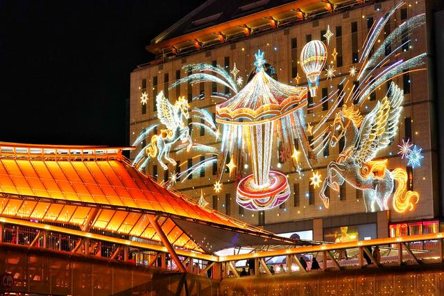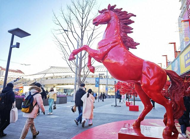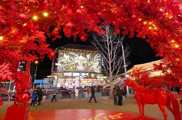 新春佳节将至,北京西单商圈年味渐浓,成为市民打卡迎新的热门地。街头矗立的红色骏马雕塑昂首扬蹄,与满树红花、璀璨灯饰相映,尽显“马到成功”的吉祥寓意。汉光百货外墙上,梦幻的灯光装置勾勒出旋转木马与飞马图案,搭配暖橙色连廊灯光,营造出沉浸式节日氛围。